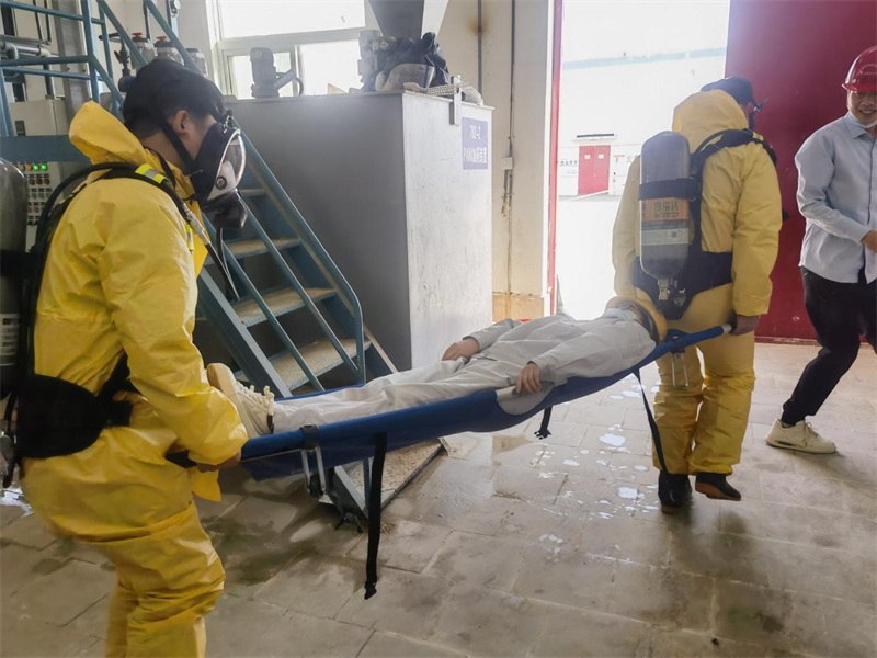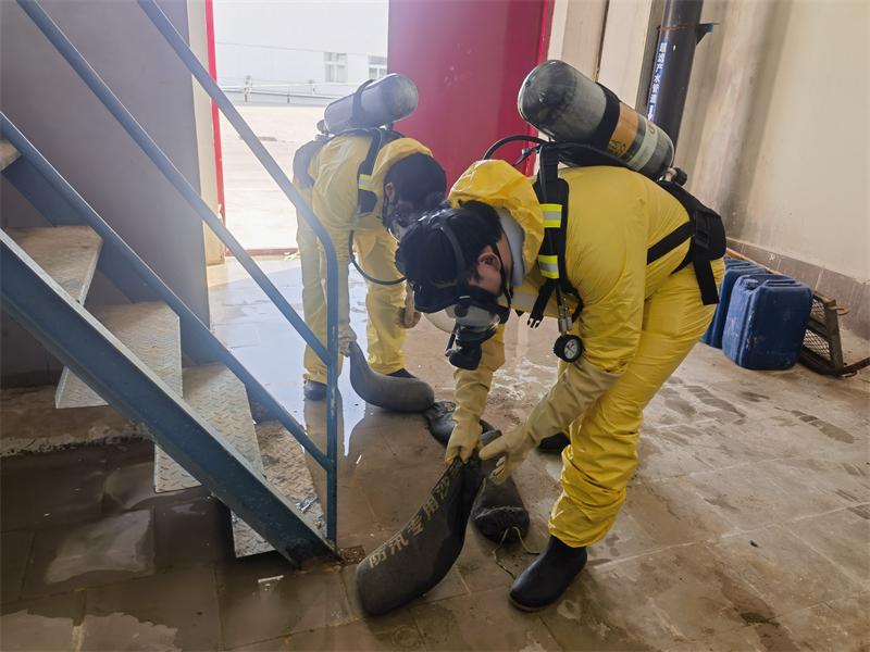 此次演練從實戰角度出發,該車間操作工在日常巡檢中發現鹽酸泄漏,迅速撤離至安全區域,同時向當班班長匯報,立即啟動事故應急預案,通過采取隔離泄漏區、用工業水稀釋漏酸、氫氧化碳對泄漏鹽酸進行酸堿中和等方式處置,將含酸廢水引至事故池進行處理。隨后,應急處置人員穿戴好防護服,攜帶搶修工具進入現場,查找出鹽酸泄漏點。經過搶修,鹽酸泄漏點成功修復。