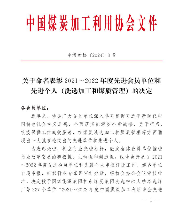 4月1日,中國煤炭加工利用協(xié)會(huì)發(fā)布的《關(guān)于命名表彰2021~2022年度先進(jìn)會(huì)員單位和先進(jìn)個(gè)人(洗選加工和煤質(zhì)管理)的決定》,新型能源選煤公司運(yùn)營的黃陵二礦、龍華、袁大灘三家選煤廠榮獲優(yōu)質(zhì)高效選煤廠稱號,黃陵二礦、龍華兩家選煤廠榮獲行業(yè)級質(zhì)量標(biāo)準(zhǔn)化選煤廠稱號,袁大灘選煤廠廠長陳文茂榮獲優(yōu)質(zhì)高效選煤廠廠長稱號。