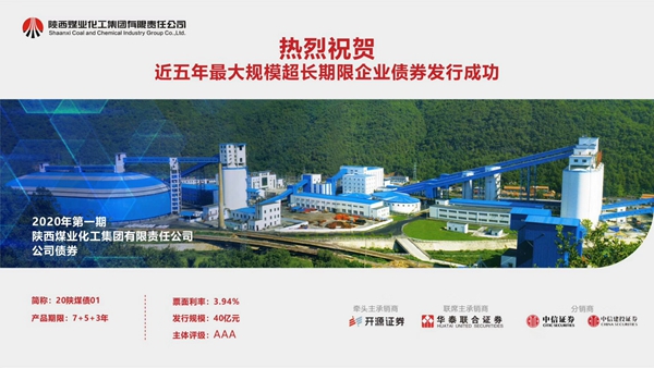 2020年3月13日,陜西煤業化工集團有限責任公司2020年第一期公司債券在中央國債登記結算有限公司簿記成功。債券發行規模40億元,期限7+5+3年期,票面利率3.94 %,比同期人民幣長期貸款基準利率低近1個百分點,創國內市場近五年超長期限企業債券單期發行最大規模。本期債券的成功發行,有效降低了陜煤集團長期融資成本,優化了資產負債結構,進一步改善了營運資金流動性。