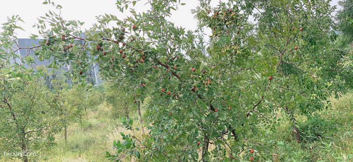 金秋十月,滿樹果實累累。紅通通的大棗壓彎了枝頭,看上去真饞人。下班后,三五成群的伙伴約伴去采摘,有全紅的、半紅半不紅的、深紅的、淡紅的、裂開縫的、不裂開縫的,隨便摘一個放進嘴里,都亦如吃了蜜似的,越吃越愛吃。