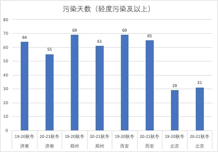 為了對(duì)比2020年的治霾效果,我們對(duì)濟(jì)南、鄭州、西安和北京這四個(gè)城市進(jìn)行了年度同期霧霾天數(shù)對(duì)比,20-21年的秋冬季,濟(jì)南、鄭州、西安的污染天數(shù)相較2019-2020年度同期,都有所下降,北京略有上升。(見下圖)