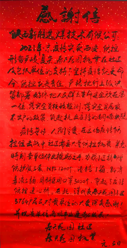 近日新型能源選煤公司收到兩封特殊的感謝信情真意切的信就像冬日里的暖陽(yáng)事情雖然平凡而感動(dòng)就是如此簡(jiǎn)單。12月30日,新型能源選煤公司為長(zhǎng)安住建局城南辦公室捐助了一批防疫物資。今日,長(zhǎng)安住建局城南辦公室和春天花園社區(qū)給選煤公司發(fā)來(lái)感謝信,表示誠(chéng)摯的謝意。